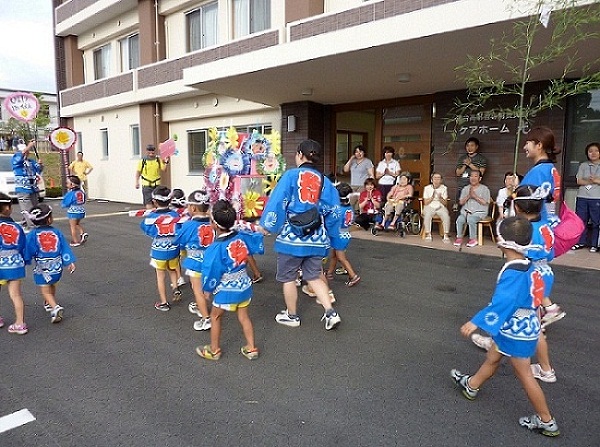 可愛らしい姿の、小さな園児が小さな神輿をかついで、ケアホーム光の駐車場まで来てくれました。今度はもっとゆっくり触れ合いたいな・・・(入居者談)(^_^)/