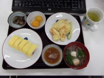 きょうの「ケアホーム光」のお昼ご飯です。 ちなみにメニューは、玉子巻きずし、天ぷら盛り合わせ、茄子の青シソ和え、それにお吸い物。デザートは今が旬のびわ! どうです、おいしそうでしょ?