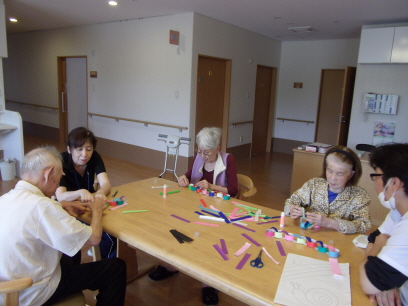 今日もシトシト外は雨(*_*)。そこで、「ケアホーム光」のみなさんで、七夕の飾りを作りました。