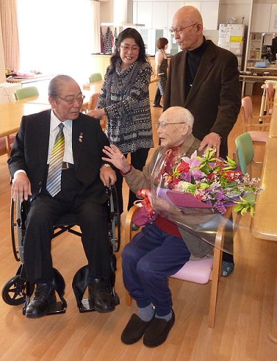 入居者様が100歳の誕生日を迎え、大村市からお祝いに来られました。